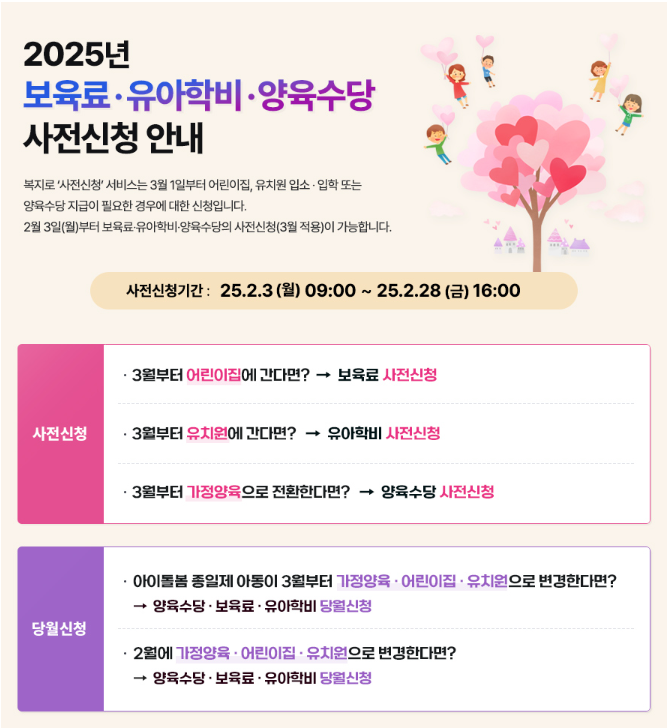 새 학기를 앞두고 보육료, 유아학비, 양육수당 사전신청에 대해 궁금한 분들이 많을 것 같아서 자세한 내용 안내 드리니 3월에 어린이집이나 유치원에 보낼 계획이 있는 부모님이시라면 기한 내에 신청하셔서 3월부터 바로 혜택 챙겨 받으세요.